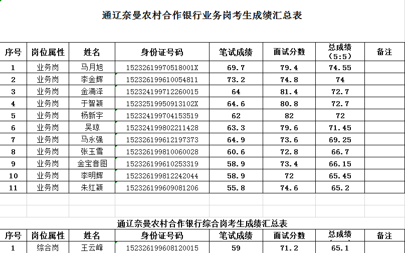 根據(jù)《內(nèi)蒙古自治區(qū)農(nóng)村信用社聯(lián)合社關(guān)于落實“凡進必考”要求、從嚴規(guī)范做好2019-2020年度應(yīng)屆高校畢業(yè)生校園招聘工作的通知》(內(nèi)農(nóng)信發(fā)〔2019〕765號)要求,通遼奈曼農(nóng)村合作銀行于2019年11月30日-12月2日,完成校園招聘筆試、資格審核及面試工作,根據(jù)筆試與面試成績5:5加權(quán)計算總成績,各崗位按照招聘計劃1:1比列最終確定12人入圍實習(xí),其中業(yè)務(wù)崗11人、綜合崗1人?,F(xiàn)將入圍人員公告如下: