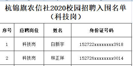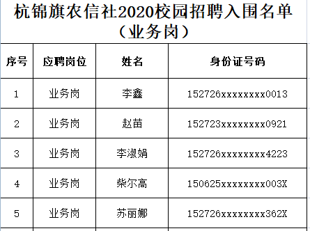 根據(jù)《杭錦旗農(nóng)村信用合作聯(lián)社2020年應(yīng)屆高校畢業(yè)生校園招聘工作方案》要求,杭錦旗農(nóng)村信用合作聯(lián)社2020年度校園招聘面試筆試全部結(jié)束,招聘計劃為:綜合崗3人、業(yè)務(wù)崗5人、科技崗2人。