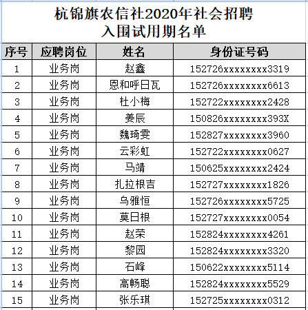 根據(jù)《杭錦旗農(nóng)村信用合作聯(lián)社2020年公開招聘公告》要求,杭錦旗農(nóng)村信用合作聯(lián)社2020年社會招聘面試筆試全部結(jié)束,本次招聘計(jì)劃為:業(yè)務(wù)崗10名,其中按1:1.5比例入圍試用期,即入圍試用期人員15名,試用期滿后按照考核排名錄取前10名。