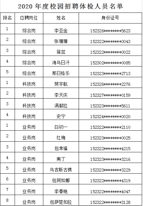 根據(jù)《內(nèi)蒙古自治區(qū)農(nóng)村信用社聯(lián)合社2020年轄內(nèi)法人機構(gòu)應(yīng)屆高校畢業(yè)生校園招聘工作的通知》要求,按照筆試與面試5:5的比例加權(quán)計算出總成績,排名由高到低確定進入體檢環(huán)節(jié)人員,綜合崗5人、科技崗4人、業(yè)務(wù)崗8人。如有自動放棄或體檢不合格的情況,將按報考崗位成績由高到低的順序遞補?,F(xiàn)將體檢工作有關(guān)事項通知如下: